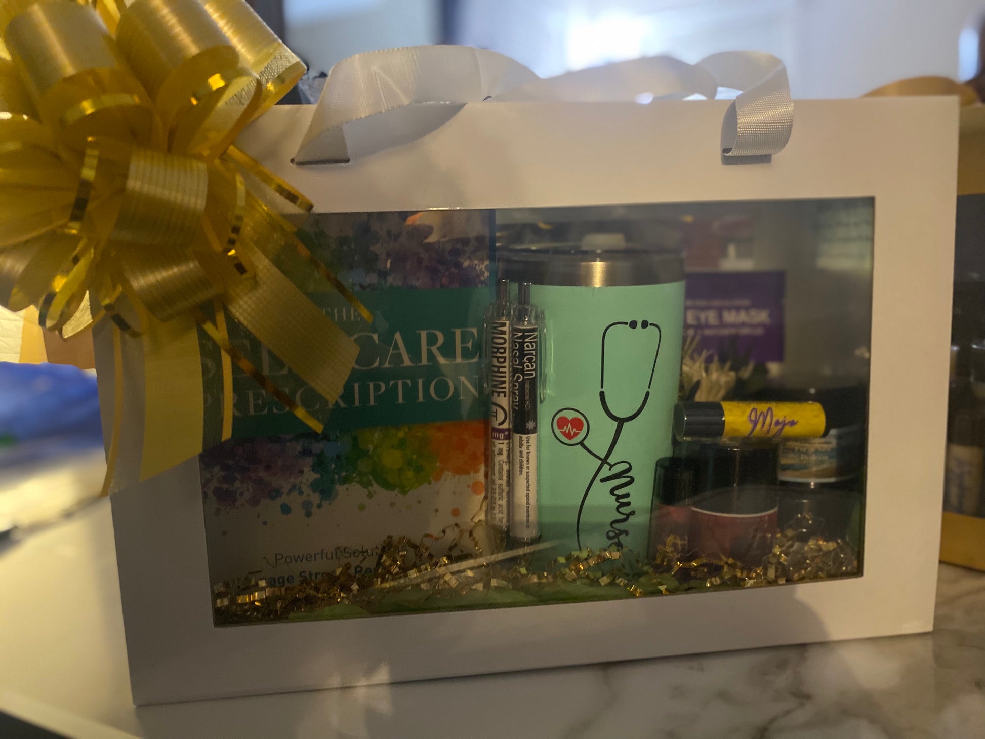 Complete with sturdy handles, a double transparent window to showcase your wellness treasures, and topped with a stunning black & gold bow.